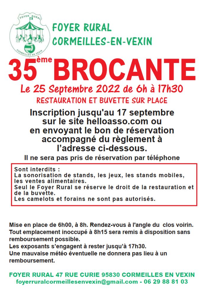 Les inscriptions pour la prochaine brocante de Cormeilles en Vexin sont ouvertes.Vous pouvez vous inscrire en ligne via ce lien ou télécharger le bulletin d'inscription et les conditions en cliquant sur ce lien